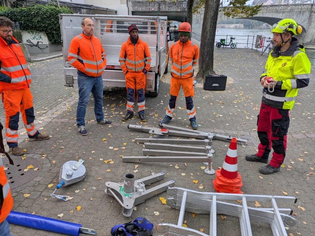 Damit das Team der Stadtreinigung des Tiefbauamts Basel-Stadt sicher in den historischen Auslaufschacht absteigen und dort Wartungsarbeiten durchführen kann, hat Simon Geiser gemeinsam mit dem Team die Arbeitsabläufe Schritt für Schritt durchgespielt, alle Mitarbeitenden im Umgang mit dem spezifischen Material instruiert und das am besten geeignete System evaluiert. Das endgültige Vorgehen wurde anschliessend von uns schriftlich festgehalten.