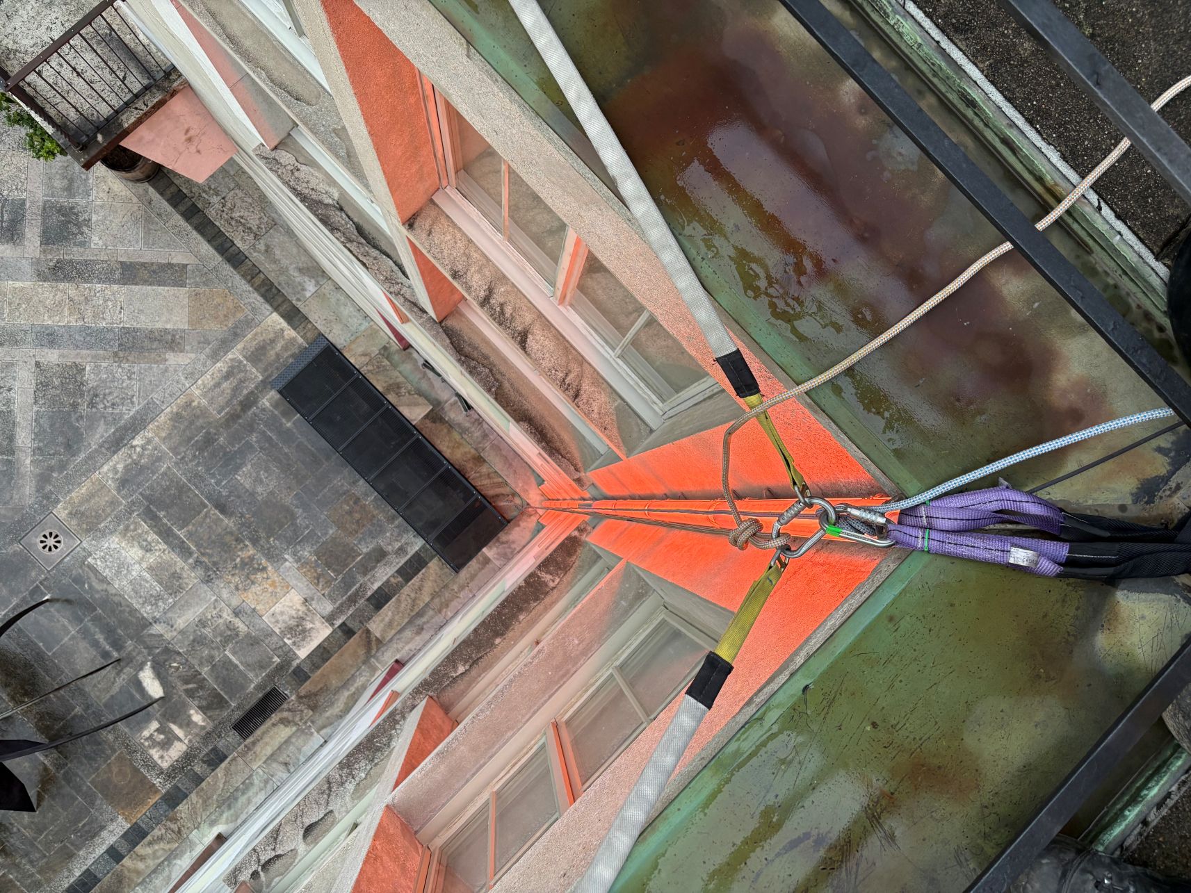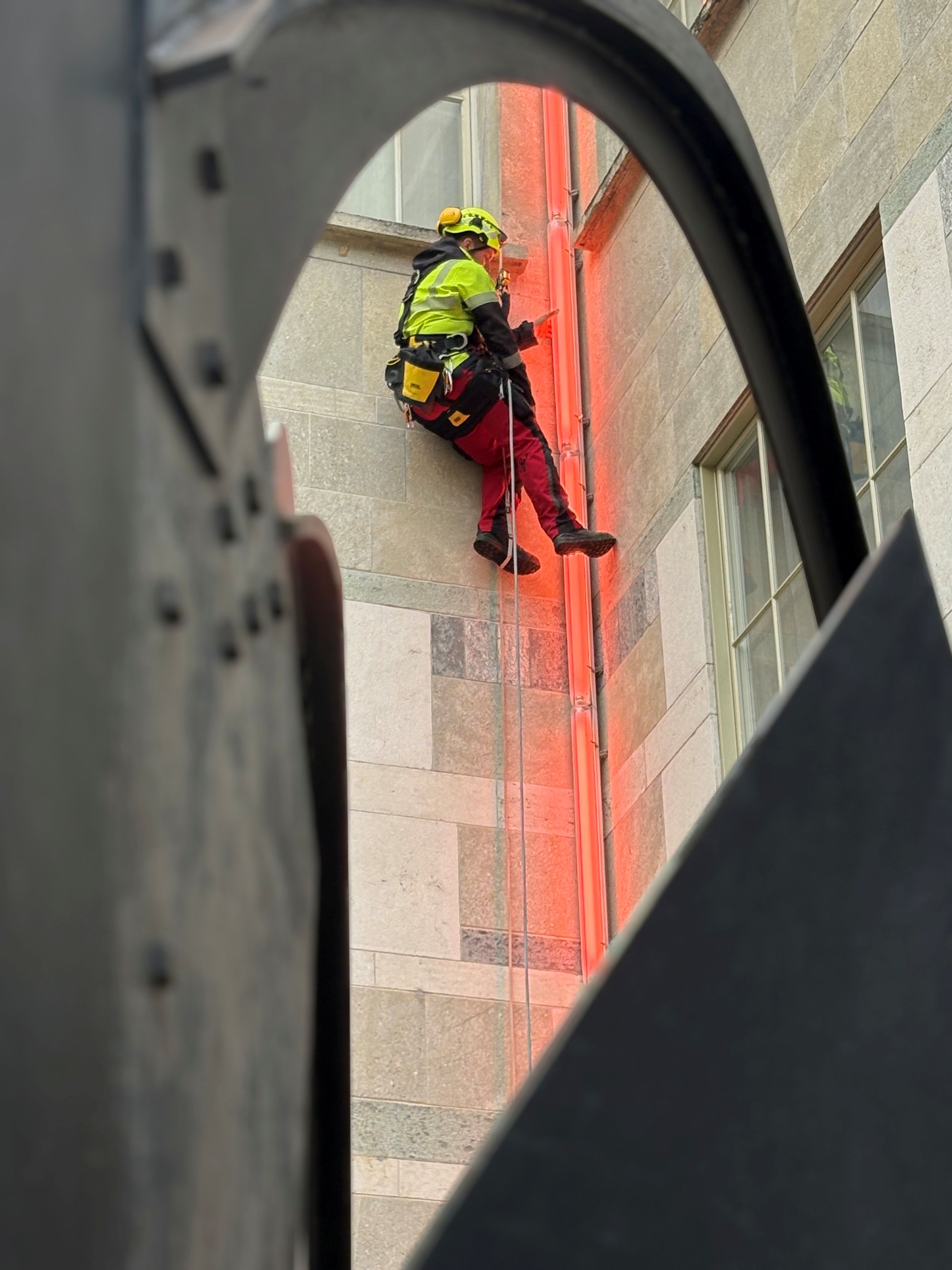 Das Einrichten einer Seilstrecke, um Arbeiten mittels Seilzugangstechnik durchzuführen, erfordert Präzision und Erfahrung und darf durchaus auch als Kunst bezeichnet werden. Im Innenhof des Kunstmuseums Basel nutzten wir diese Technik, um ein Leuchtmittel fachgerecht auszutauschen. 🔦